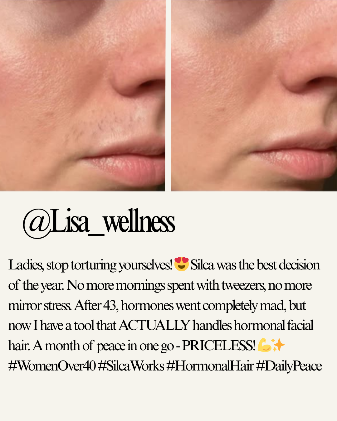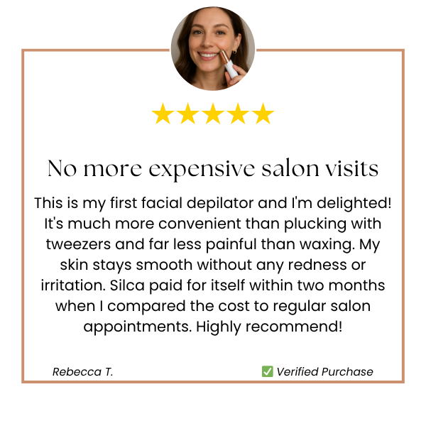 Those constant glances in the mirror. That anxiety during every conversation. Hormones don't ask permission – they attack your face with dark hairs at the worst possible moment. Tweezers, wax and razors fail with menopausal hair. Silca™ is the only epilator created specifically for hormonal mustache in women 40+. Take back control of your face – once every 4 weeks.