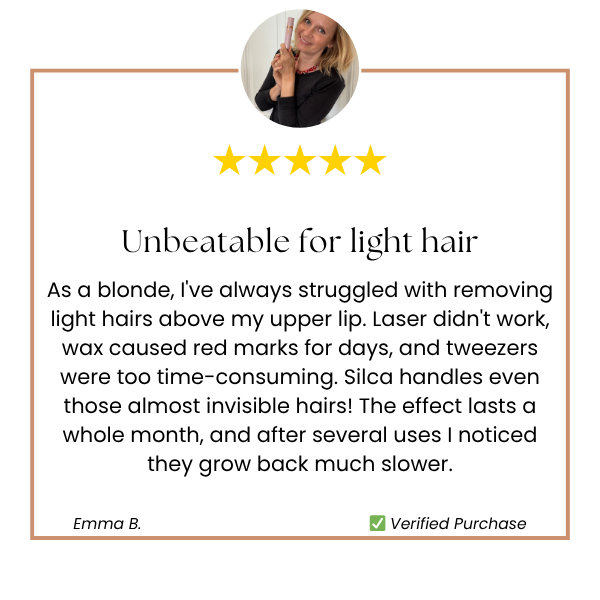 After years of battling my mustache I tried everything - wax, tweezers, creams. Silca is the first thing that actually removes hair for this long. 4 weeks of peace is an amazing feeling!